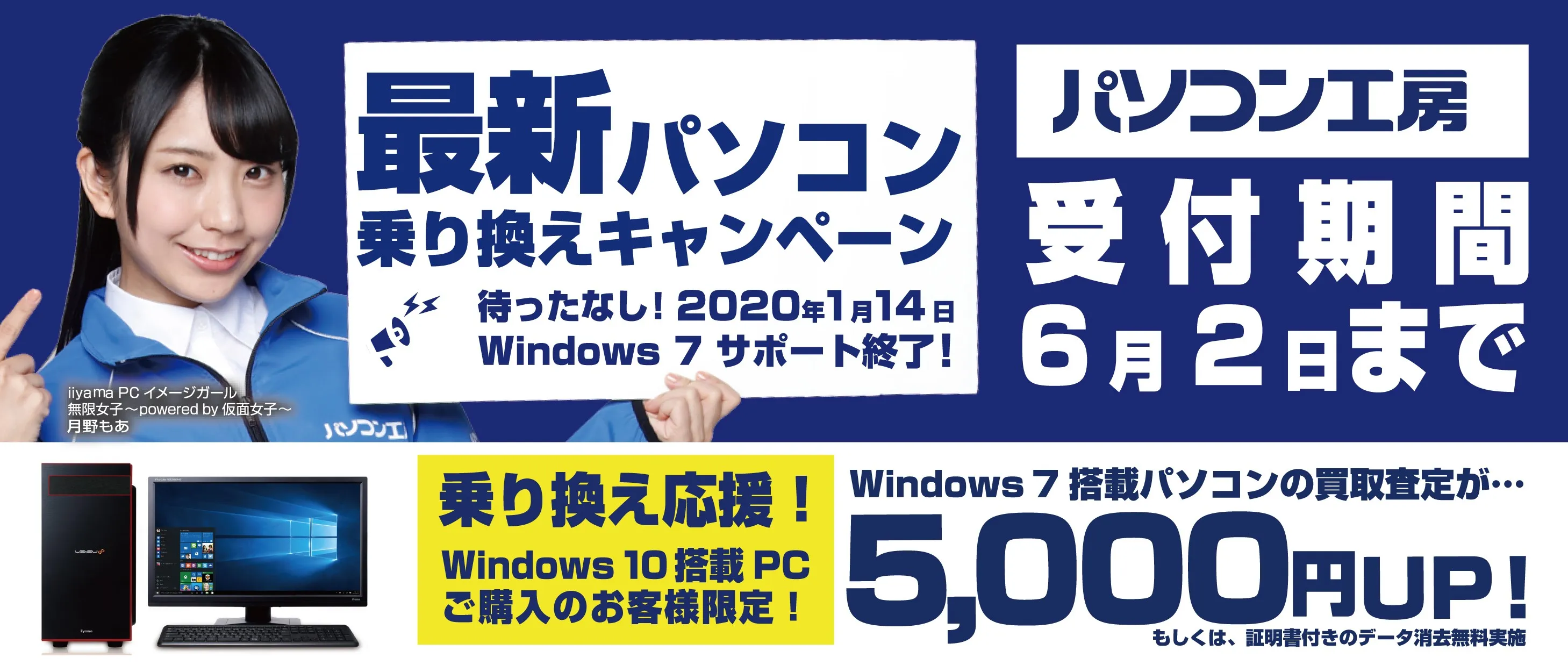 パソコン工房・グッドウィルを運営する株式会社ユニットコム(代表取締役:端田 泰三、本社:大阪市浪速区)は、全国のパソコン工房・グッドウィルの店舗、インターネット通販。法人営業部にて、2019年6月2日(日)までの期間限定で、Windows 7からWindows 10への乗り換えの際、Windows 7搭載パソコンの買取査定が5,000円増額、または、証明書付きのデータ消去サービスが無料となる下取りキャンペーン『最新パソコン乗り換えキャンペーン』を開始いたします。
