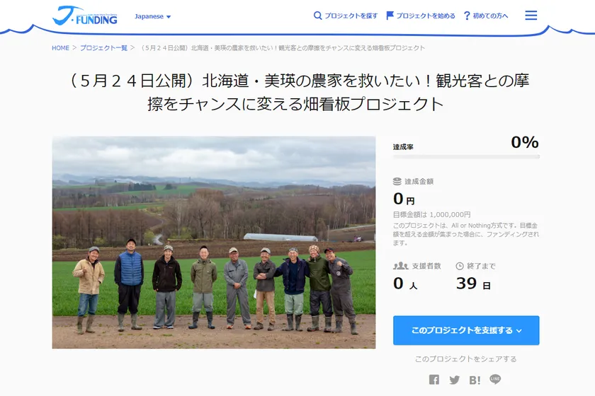 2019年5月24日、北海道美瑛町農家(以下 農家)は、美瑛の観光公害を解決すべく、クラウドファンディング「JAPANKURU FUNDING」にて、目標金額100万円「畑看板プロジェクト」に挑戦いたします。北海道美瑛町は年間の観光入込客数が160万(※1)を超える人気観光地。しかし、観光客が農地に無断で侵入し、農作物を踏み荒らすなどの観光公害が深刻化しています。農地と美しい農業景観を守るために農家が自ら立ち上がり、プロジェクトスタートの資金調達のためクラウドファンディングに挑戦します。