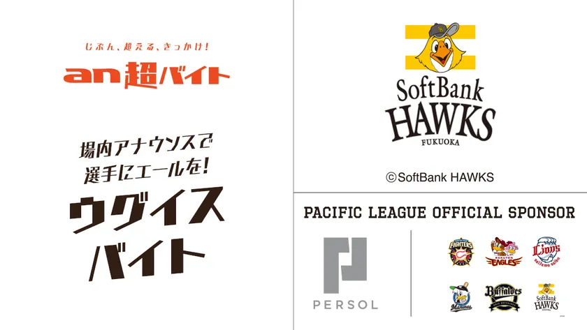 アルバイト求人情報サービス「an」< https://weban.jp/ >を運営するパーソルキャリア株式会社(本社:東京都千代田区、代表取締役社長:峯尾 太郎)は、思わず挑戦してみたくなるような「an超バイト」の新企画として、6月16日(日)13:00~福岡 ヤフオク!ドームにて行われる、「パーソルDAY 福岡ソフトバンクホークスvs横浜DeNAベイスターズ」のパーソル冠協賛試合を盛り上げるために、場内アナウンスを使って選手にエールを送る“ウグイスバイト”を募集します!報酬は、日給5万円を支給。さらにサイン入りユニフォームもプレゼントします。