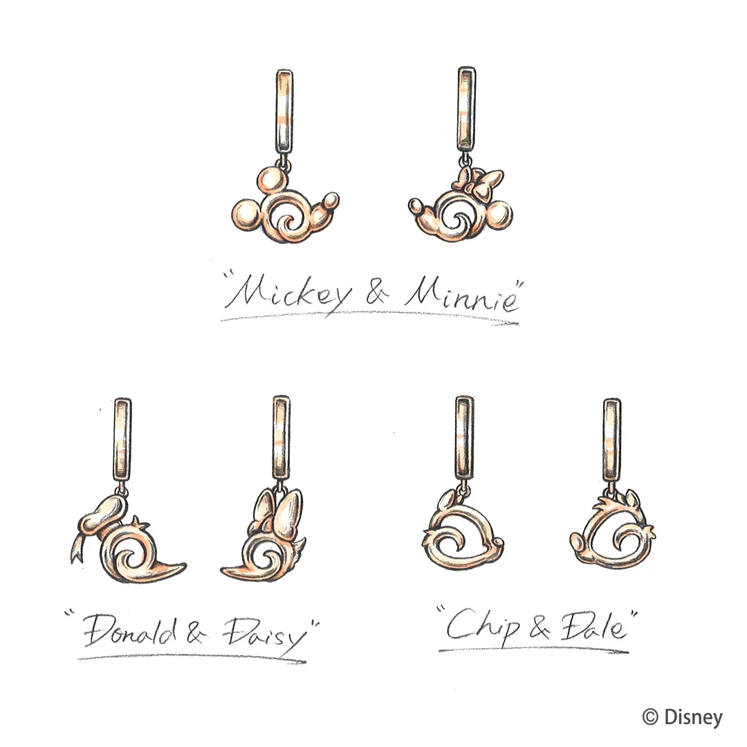 アラベスク模様のようなデザインが上品なイヤリング。”ミッキー&ミニー”、“ドナルド&デイジー”、“チップ&デール”のフェイスをモチーフにしたクラシカルなデザイン。