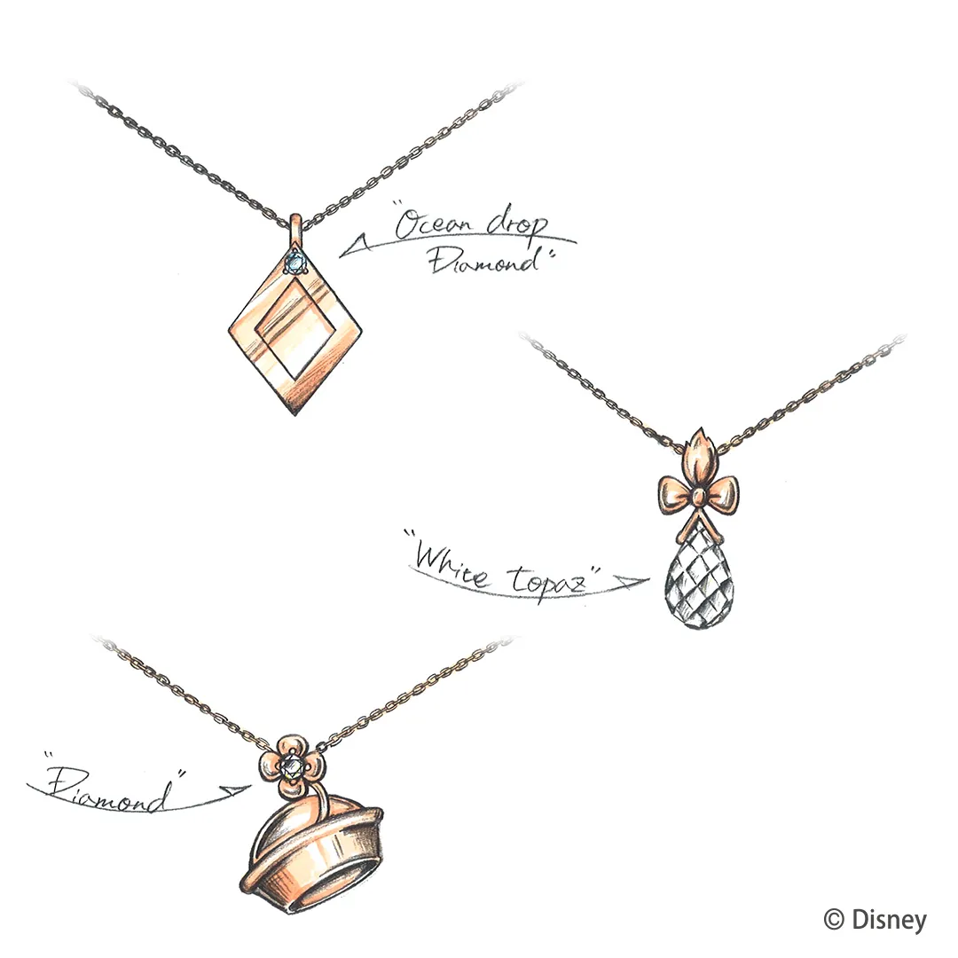ガールズキャラクターのモチーフをさりげなく表現したネックレス。“ミニー”の帽子、“レディ”の首輪のチャーム、“マリー”のリボンと頭の毛をモチーフにした、日常使いしやすいデザイン。