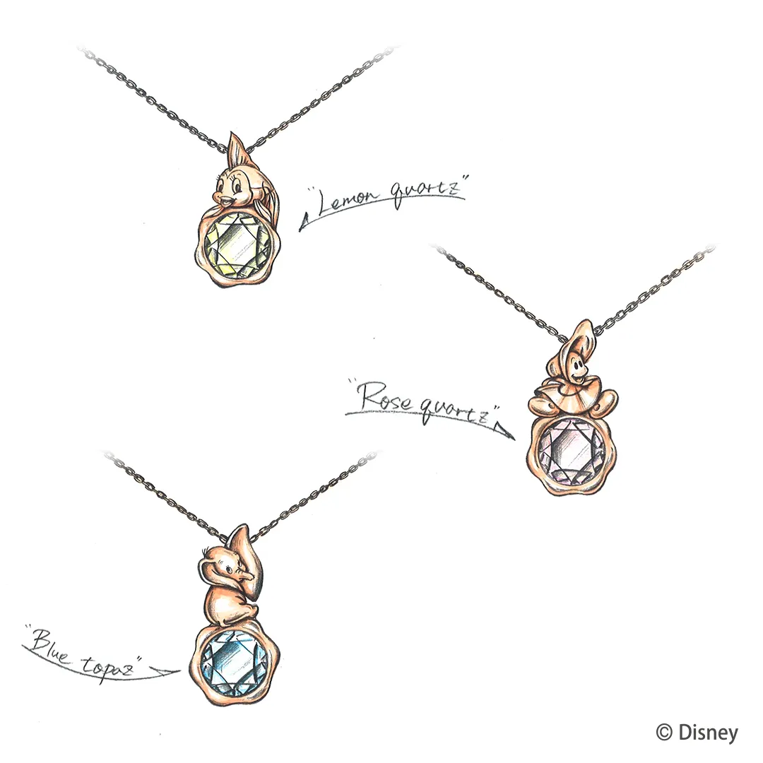 キャャラクターの雰囲気に合わせたカラーストーンがキュートなネックレス。“ヤングオイスター”、“ダンボ”、“クレオ”をモチーフにした、キャラクターの可愛さが溢れるデザイン。