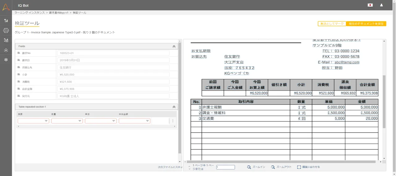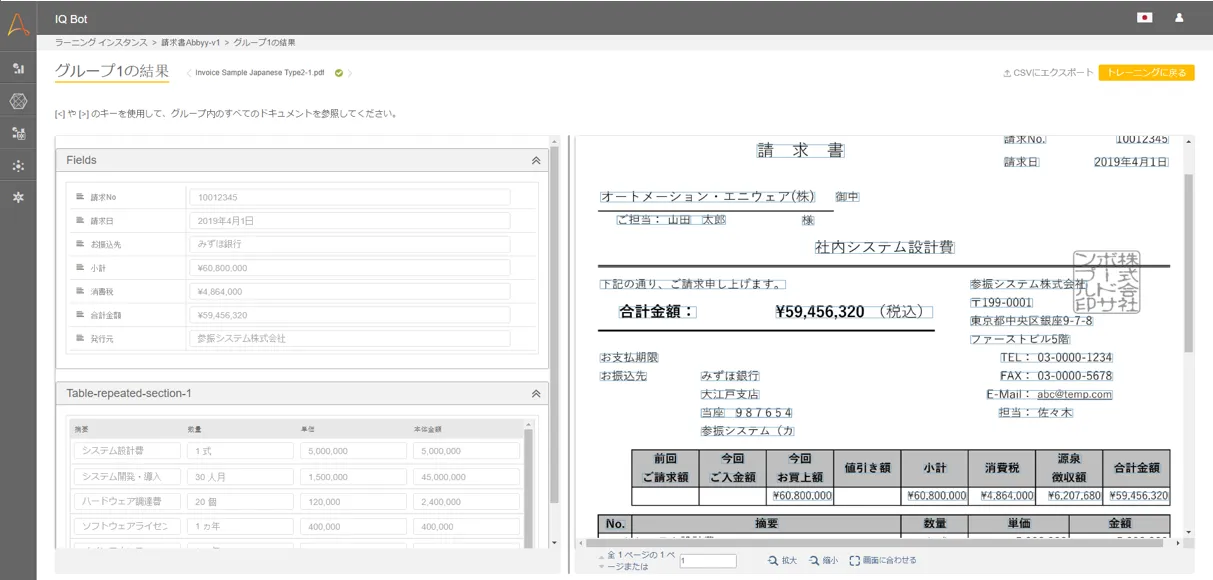 【請求書処理を終えた結果のレビュー画面の例】