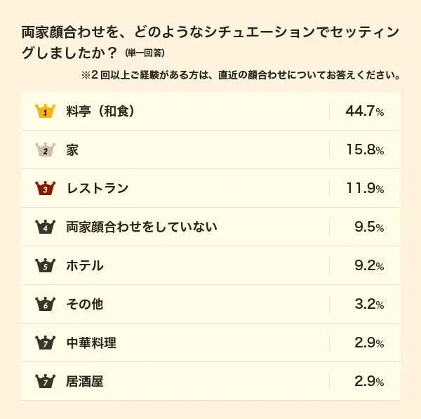 1位になったシチュエーションは日本ならではのあの場所!?「両家顔合わせ」で半数近くの家族が選んだ場所って?