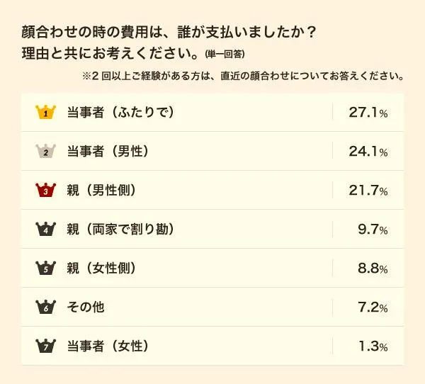 回答は「当事者(男性)」、「当事者(女性)」、「当事者(ふたりで)」、「親(男性側)」、「親(女性側)」、「親(両家で割り勘)」、「その他」の7つの選択肢の中から答えていただきました。