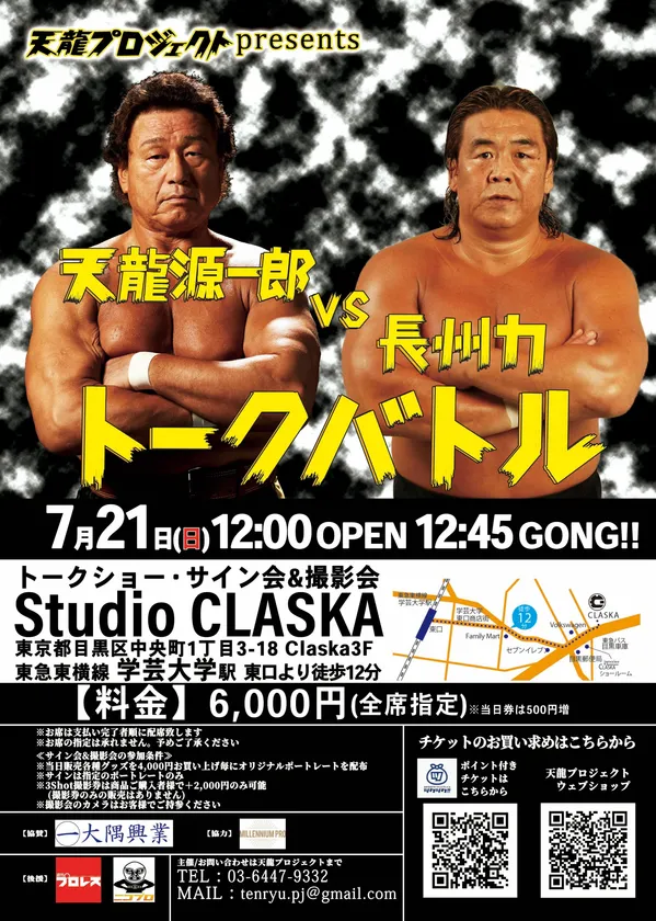 天龍源一郎のマネジメントを主とする元プロレス団体・天龍プロジェクト(ルネッサンス株式会社 代表:嶋田 紋奈)は、天龍プロジェクトPresentsトークイベント第10弾「天龍源一郎 VS 長州力 トークバトル」を、2019年7月21日(日)Studio CLASKA(東京都目黒区)にて開催します。