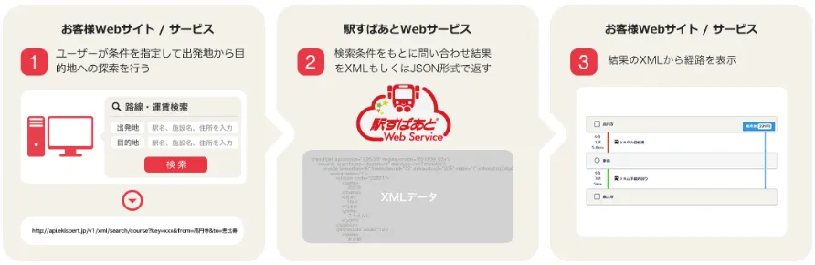 クラウドサービスやWebサイト、スマートフォンアプリなどに経路検索や運賃計算機能、全国の公共交通機関データなどを自由に組み込むことが可能です。
