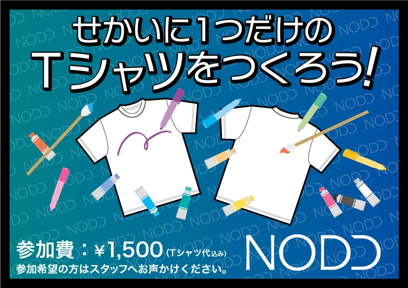 NODDとしましては、幼児から遊べる、Tシャツに自由に絵を書いてアートを体感できるオリジナルワークショップを開催。楽しめる空間作りをしていくほか、フェスで人気のTシャツ・フェイスタオル・キャップ等を、NODDブランドアイテムの中から販売します。