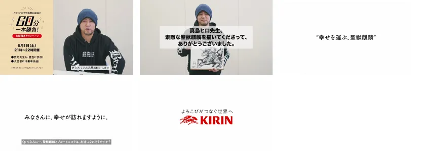 本企画は、昨年大反響を呼び、たくさんの方が参加した「#キリンの聖獣真剣お絵描き60分一本勝負」のスペシャルゲストとして、プロの漫画家である真島ヒロ先生に参加していただくものです。若者に大人気の漫画家であり、普段からプライベートでもTwitterでたくさんの絵を投稿されている先生にご参加いただくことで、より多くのお客様に「幸せを運ぶ、聖獣麒麟」について知っていただき、キャンペーンにもご参加いただきたいという想いから、実施された企画です。動画の中では、先生の精密で美しいペンさばきはもちろんのこと、「キャラクターのアイディアはどこで考えていますか?」や「幸せを感じるときは、どんなときですか?」など、先生自身のことをお聞きしたインタビューも収録しています。日々漫画と向き合う先生の、ここだけでしか聞けないお話も、ファン必見の内容となっています。