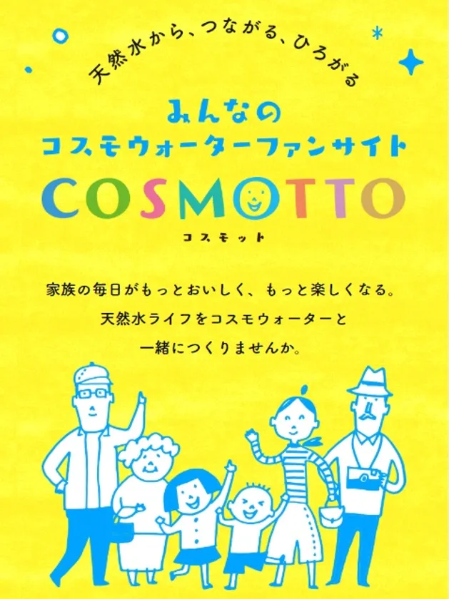 株式会社コスモライフ(本社:兵庫県加古川市、代表取締役社長:荒川 眞吾)は、天然水の魅力や活用方法、コスモウォーターご利用中のお客さまとのコミュニケーション活動等、天然水ライフが充実するための役立つ情報を発信するコスモウォーターファンサイト「COSMOTTO(コスモット)」を6月3日(月)よりオープンいたします。