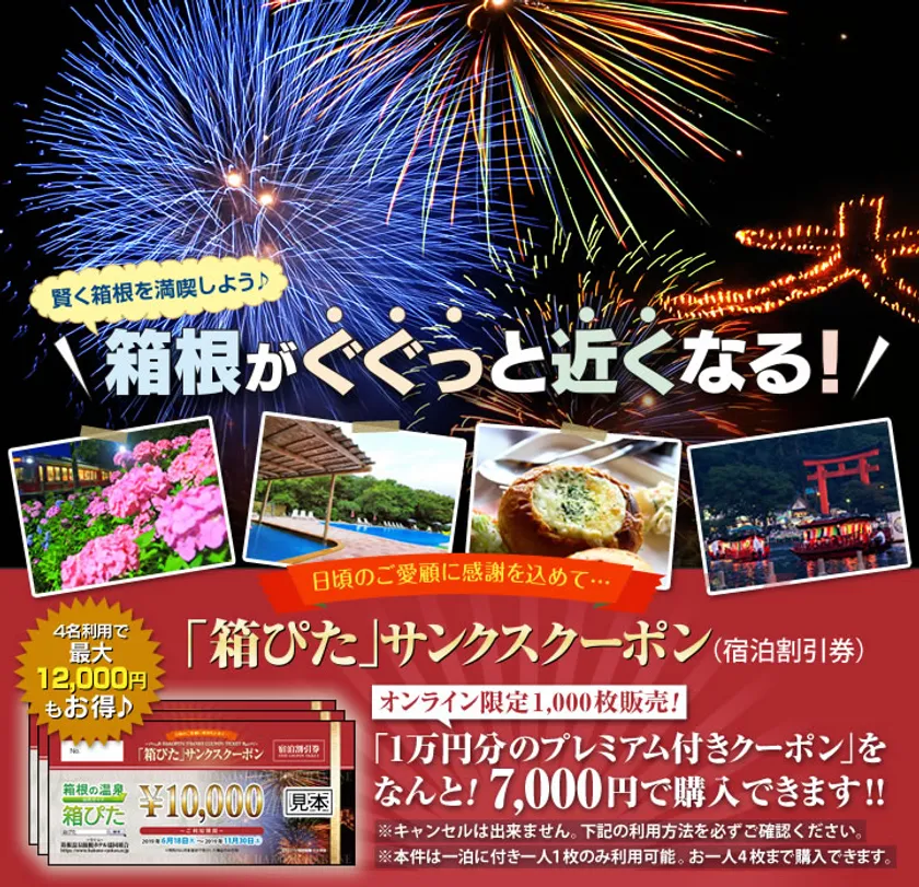 10,000円分のクーポンを7,000円でお得に購入! 箱根での宿泊に利用できる「箱ぴた」サンクスクーポン第1弾 6月11日より1,000枚限定でオンライン販売開始