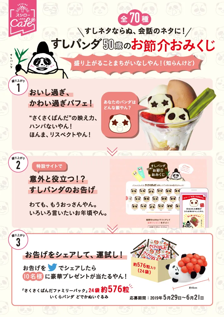 スシロー公式HPにてさくさくぱんだの顔全70種類を一挙紹介!その中からお好みの顔を選ぶとその日の運勢が占えるおみくじもあり、おみくじの結果をSNSでシェアすると抽選で豪華プレゼントが当たるキャンペーンを実施中!<応募期間:2019年5月29日(水)~6月21日(金)>