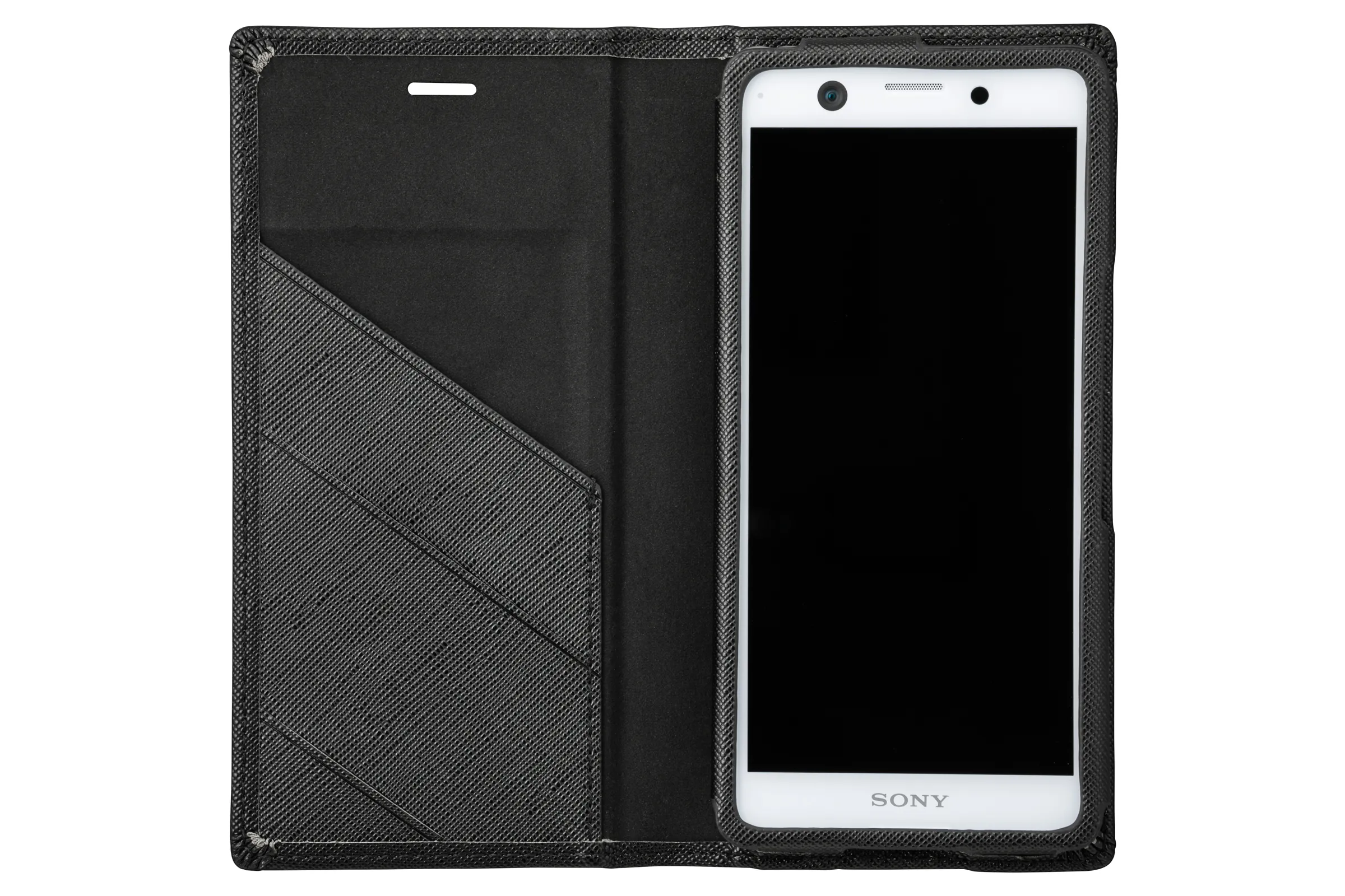 フラップは内蔵のマグネットでフレームに固定されます。ベルト類や余分な装飾を省いた、ミニマルなデザインに仕上げています。特殊な位置にマグネットを入れることでXperia(TM)のオートスリープに対応しています。
