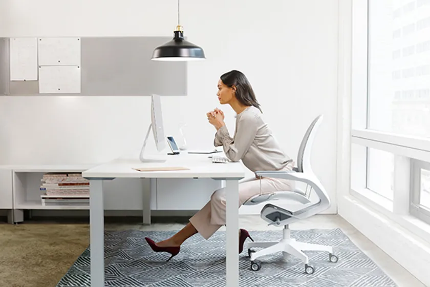Eleaのシートに深く腰掛けると、大きく反った背もたれが腰から背中にかけてフィットし、ホールド性の高さを感じます。背骨がS字を描き、骨盤が立っている理想的な着座姿勢をサポートすることができるので、長時間のデスクワークでも、腰痛や肩こりといった身体への負担が軽減されます。アームレスト部分から4本のスチールロッドによって吊り下げられたシートは、デスクワーク中のあらゆる身体の動きに連動します。また、弾力性と通気性・耐久性に優れたエラストメリック・メッシュを採用し、体圧がバランスよく分散されるように設計。時間の経過とともによくありがちな“前のめりや前すべり”を防ぎ、意識しなくても理想的な着座姿勢を維持することができます。