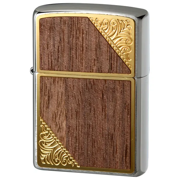 つややかな木目とゴールドのフレームの組み合わせが美しいZippoライター。使い込むほどに手に馴染んでいく経年変化も楽しめます。