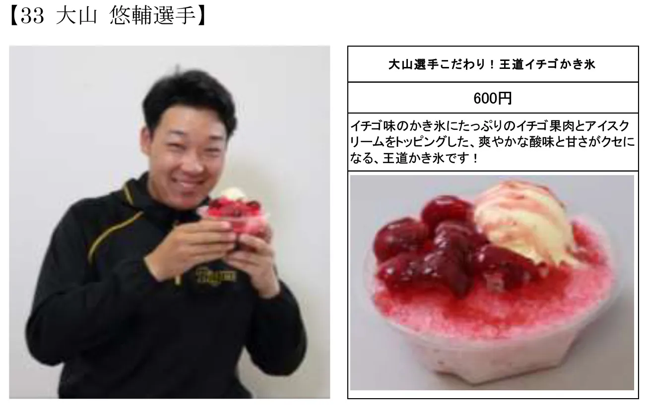 大山選手コメント「いつ僕のメニューを作ってもらえるのかと楽しみにしていました。お子さんから大人の方まで、皆さんが好きなイチゴかき氷に仕上がっているので、是非甲子園でこのかき氷を食べて熱い応援をお願いします!」