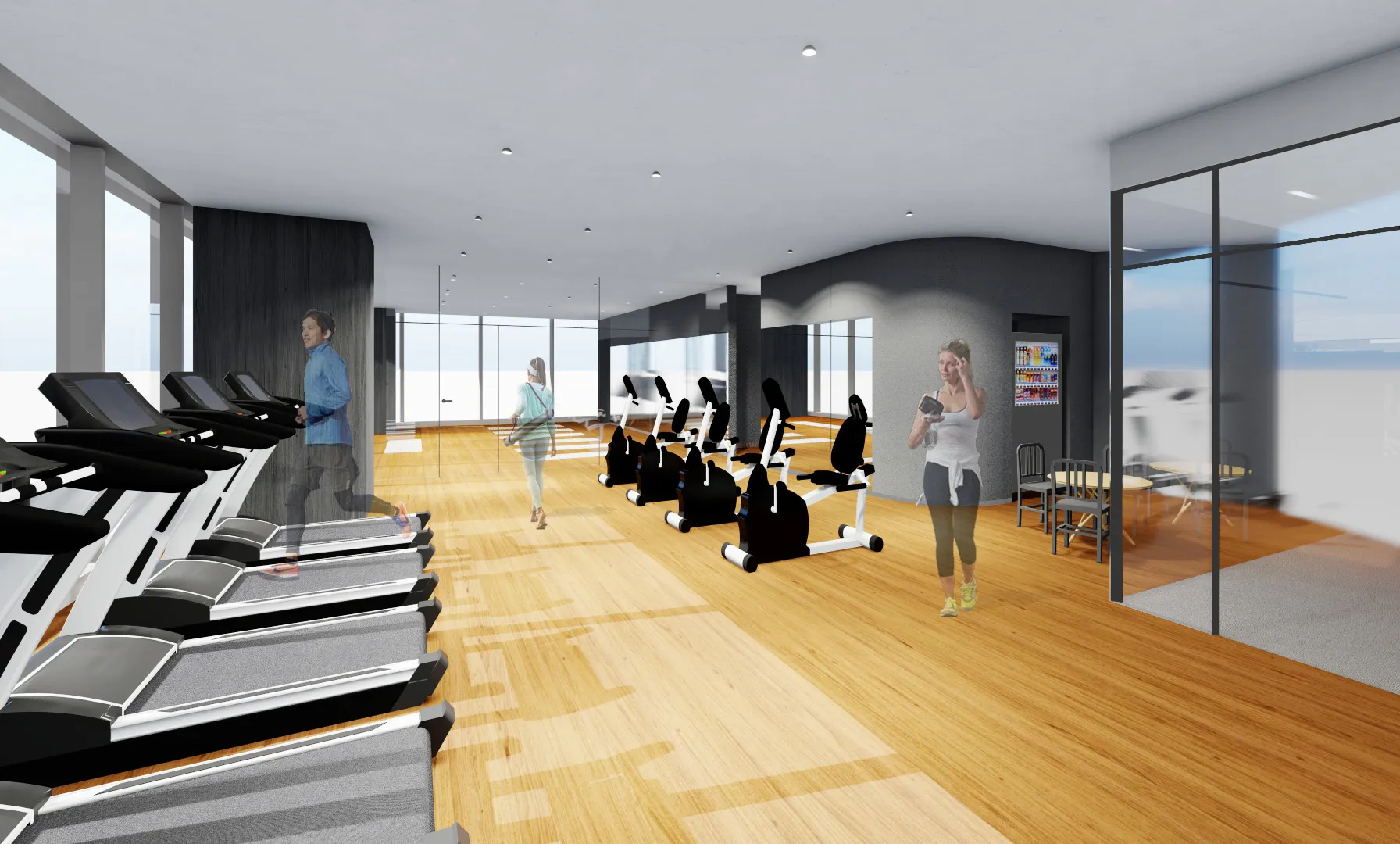 眺望を楽しみながらエクササイズができるフィットネスジムをご用意。シャワーやロッカーも完備し、仕事の合間の気分転換やアフター5の運動不足の解消にご利用いただけます。