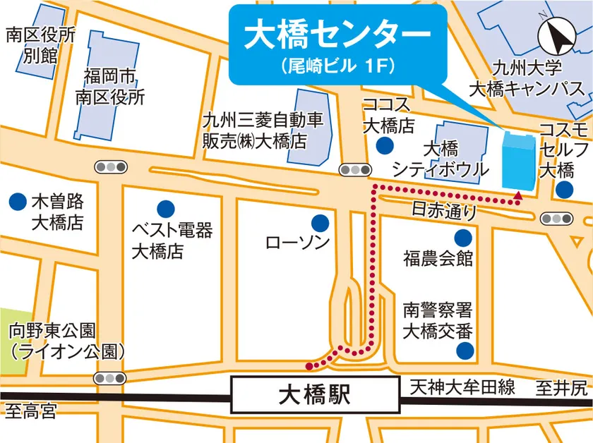 大橋センターは西鉄天神大牟田線「大橋」駅から徒歩3分、国道385号(日赤通り)に面した1階路面に出店いたします。同センターの出店により、福岡市内の店舗数は4店舗となり、福岡エリアでの収益拡大を目指してまいります。