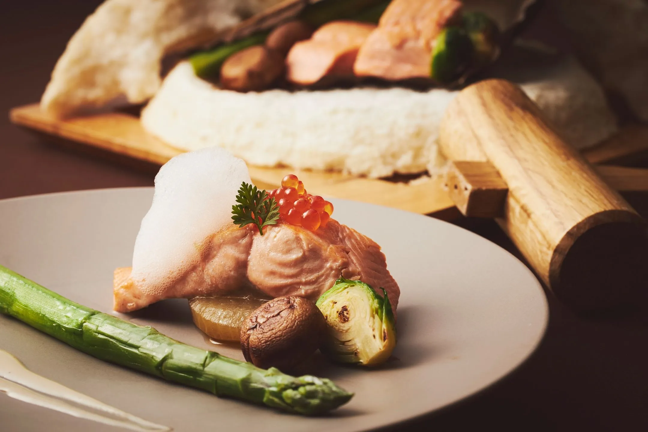 鮭のフィレを塩釜で蒸すことで、鮭にほどよく塩が入ります。これにより、しっとりと仕上がり旨みがより引き立ちます。