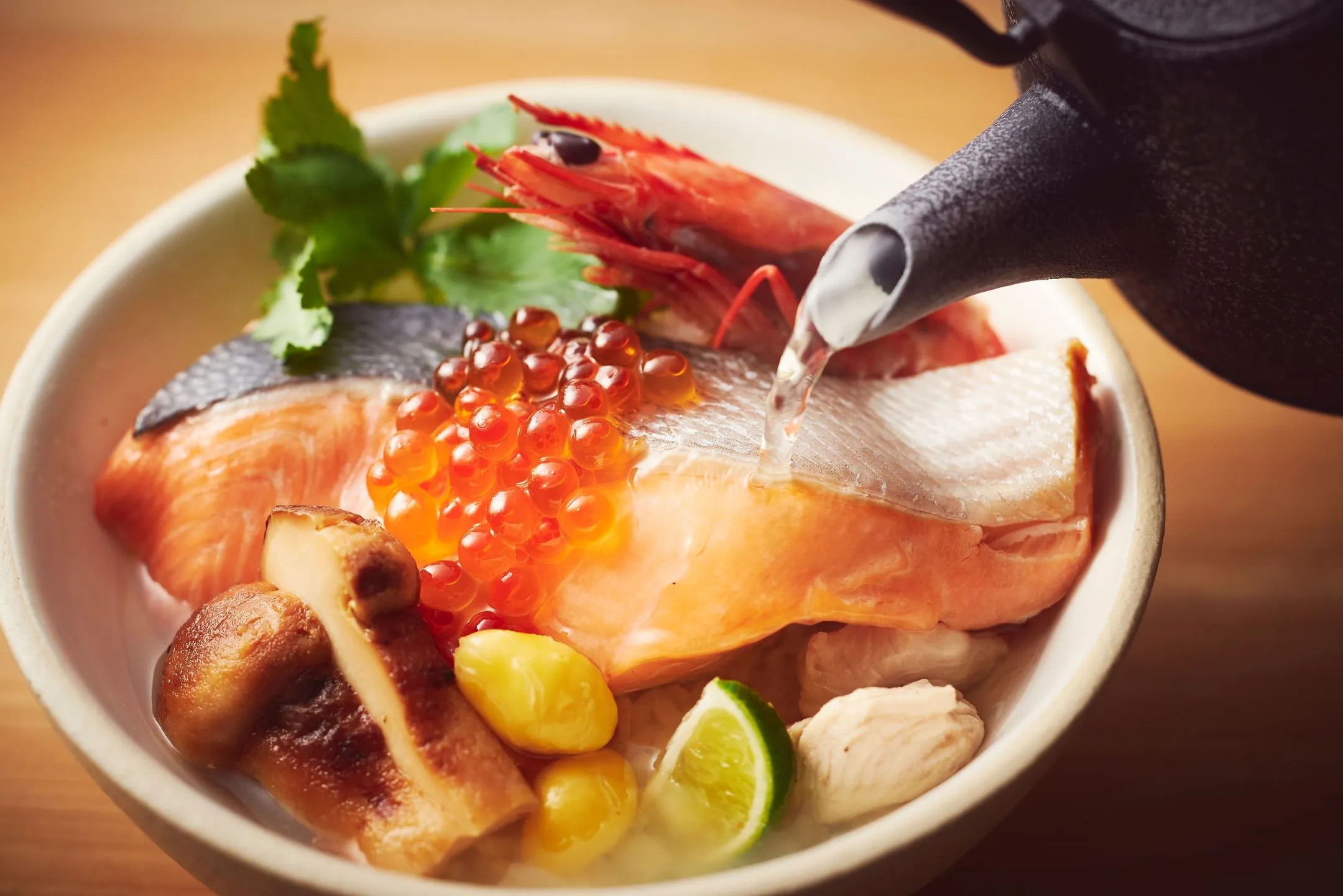 使用する食材にこだわり、秋の味覚を感じられる朝食として「究極の鮭茶漬け」を提供します。メインには、遡上に備えて栄養を蓄え、脂の乗りが格別に良い鮭を使用します。その漁獲量は、数千尾に1本とも言われるほどです。また、出汁に使用する食材は濃厚でコクのある出汁が取れる昆布と、香り豊かな松茸です。この出汁が、お茶漬けの風味を引き立てます。さらに、味の変化を楽しめるよう、トッピングとして塩味のあるいくらを用意します。