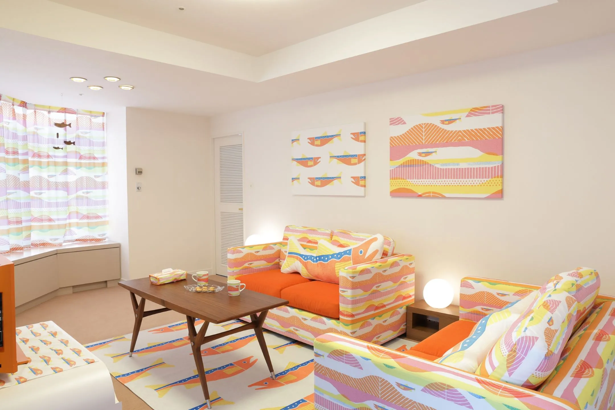 ベッドルームは、川を泳ぐ鮭を表現した空間です。川をイメージした青色の絨毯、鮭の切り身や姿をデザインの基調としたベッドカバーや、ミニクッションなどが設えられています。また、ベッドボードには、川で鮭を狙うクマをイメージしたパネルが設置してあります。さらに、鮭の顔がデザインされたナイトキャップと、オレンジ色のパジャマを用意。まるで鮭になった気分を味わえることも当客室の特徴のひとつです。