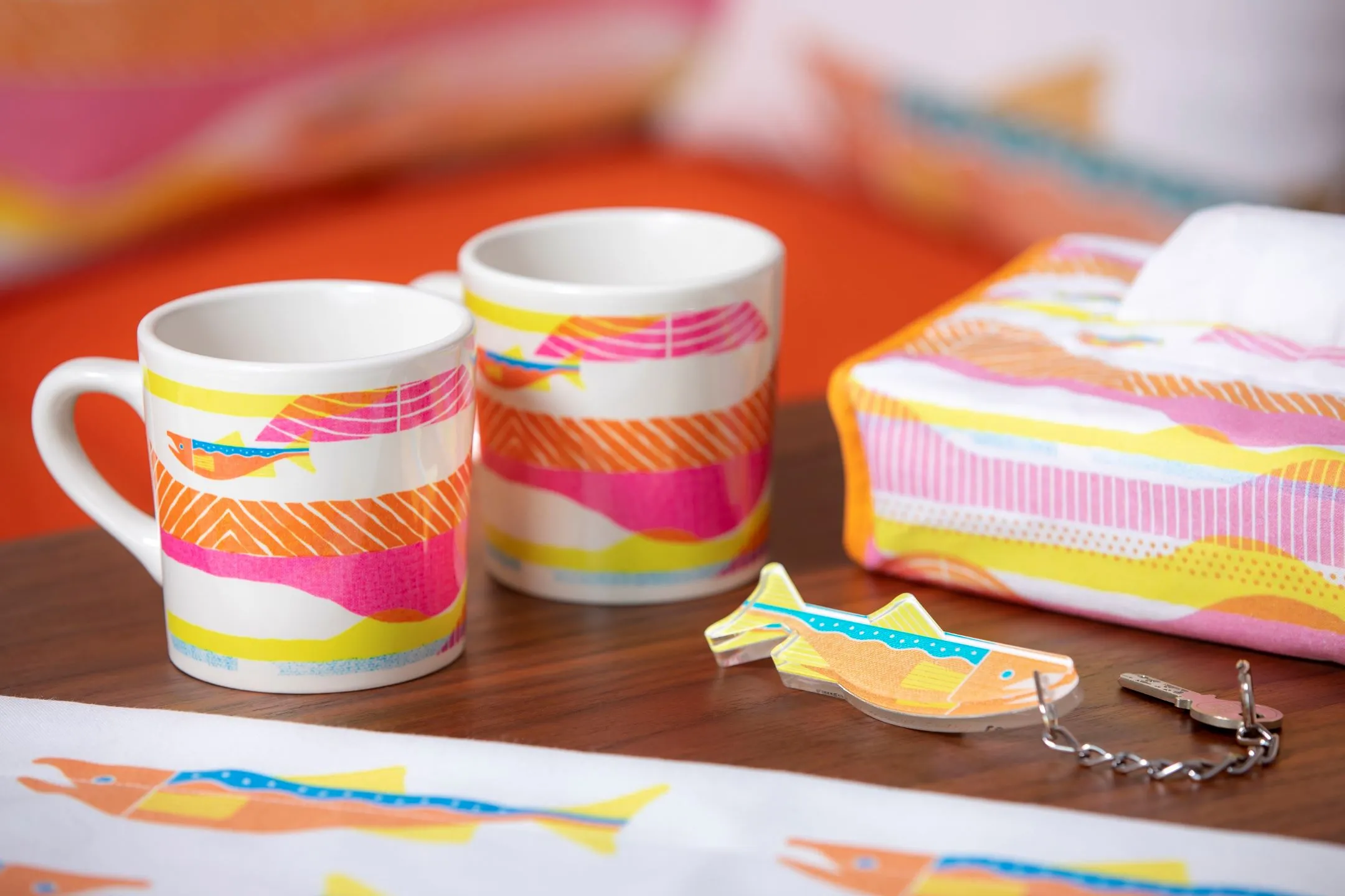 鮭ルームには、鮭の切り身や姿をデザインの基調としたソファやクッション、カーテン、マグカップなどが客室に設えられています。今年から、マグカップなどと同じデザインの鮭バスタオルを新たなグッズとして追加します。