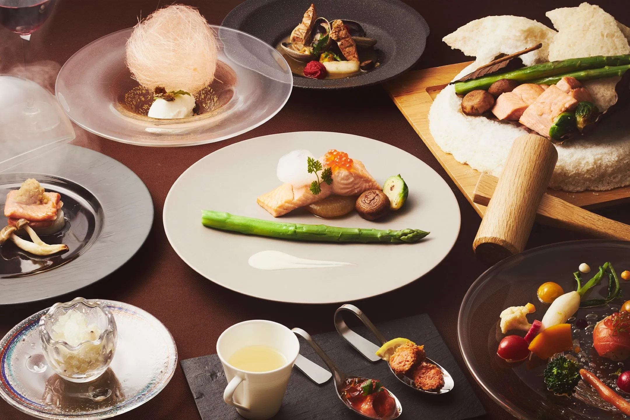 鮭のさまざまな部位を使ったコース料理です。鼻先から背や腹まで、それぞれを「焼く」「煮る」「揚げる」「凍らす」「蒸す」という調理法を用いて、鮭を余すところなく提供します。今年はメインとして、「鮭フィレの塩釜焼」が登場します。これは、鮭のフィレをマッシュルーム、野菜と一緒に塩釜で包み、蒸すことで旨味を閉じ込め、身の柔らかさを堪能できる一品です。また、お客様の目の前で蒸したてを盛り付け、ワインソースを添えて仕上げます。