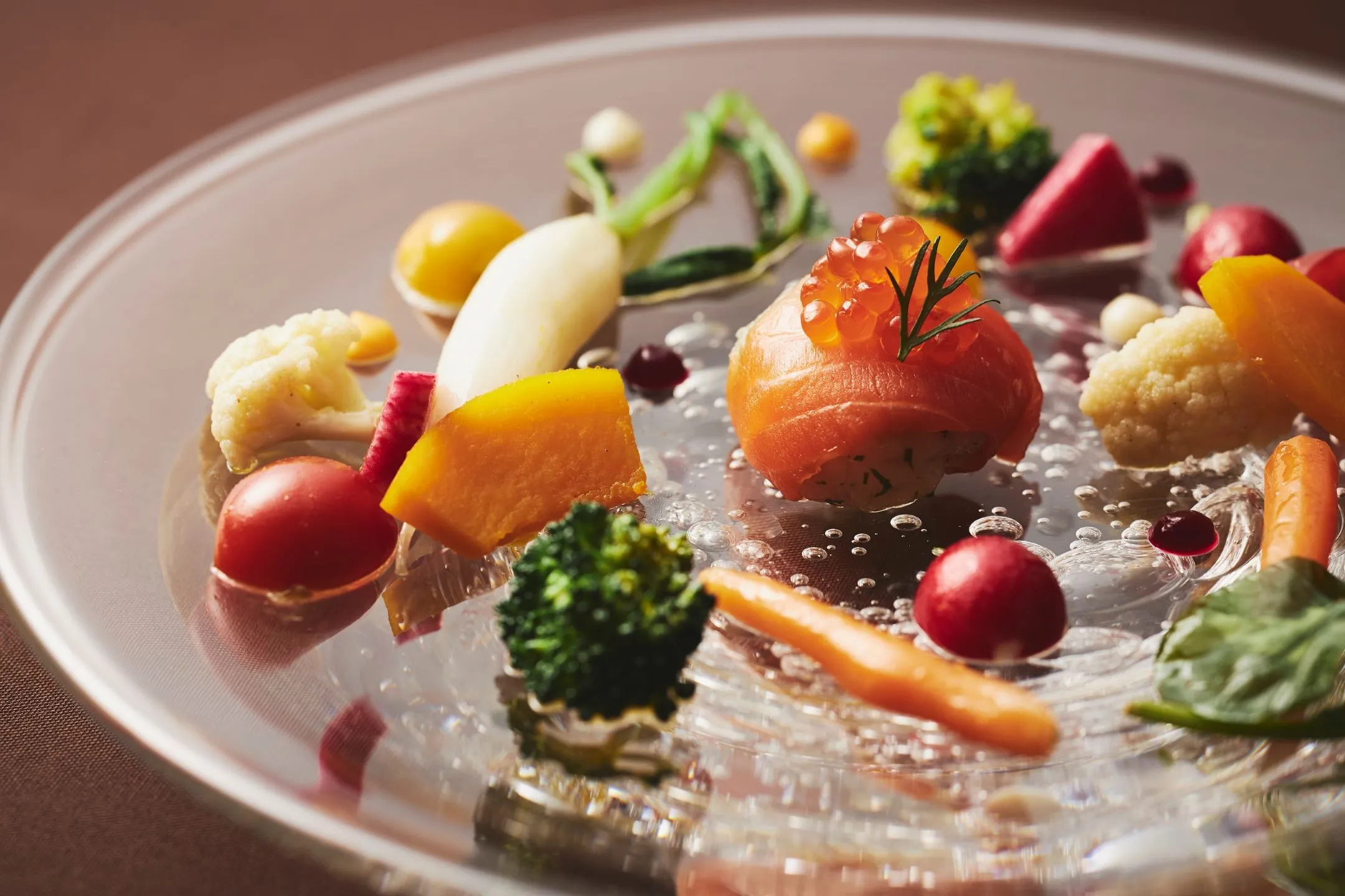 鮭と帆立、旬の野菜と鮮やかな3種のソースの味わいを堪能できる一品です。
