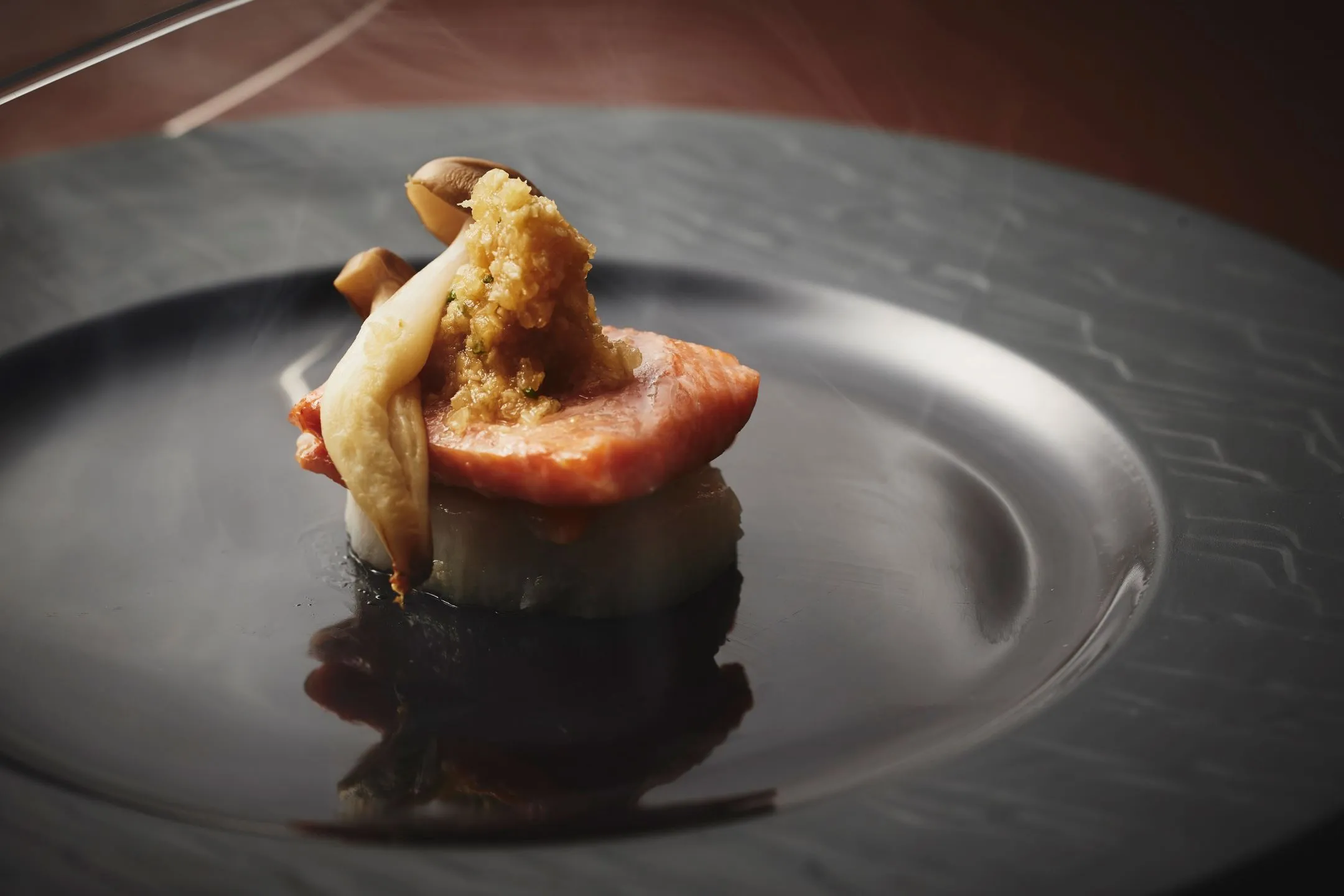脂が増した鮭に腎臓の塩漬けをアクセントとして加えることで、鮭の身と白カブの味わいが引き立つ一品です。
