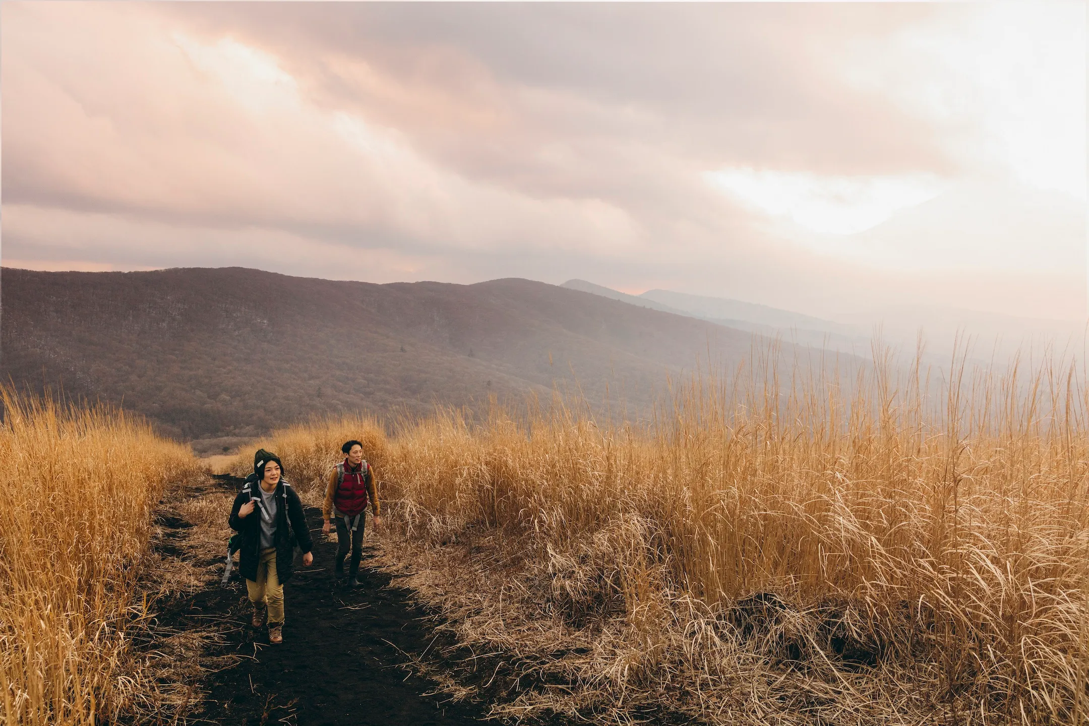 トレッキングする山は、星のや富士から車で40分の場所に位置する山中湖の近くにあります。日の入の時刻から歩き始め、ススキが広がる登山道を進むと、30分ほどで標高1200mの山頂へ到着します。昼間のトレッキングとは違い、暗さによって視界が制限されるため、視覚以外の五感が研ぎ澄まされることを感じます。自然の空気の美味しさ、山の静寂を感じながら歩くことで、昼間には得られない新鮮な感覚を得られるはずです。