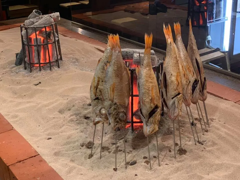 原始焼きとは「遠火で強火」の炭火でじっくりと焼く、昔ながらの調理法です。中でも、逆さに立てた鮮魚は余分な水分が流れ落ち、旨味が凝縮。また、滲み出る魚自身の脂で表面パリッと香ばしく、中はふんわりとジューシーに焼き上がるため、「究極の焼魚」と呼ばれています。