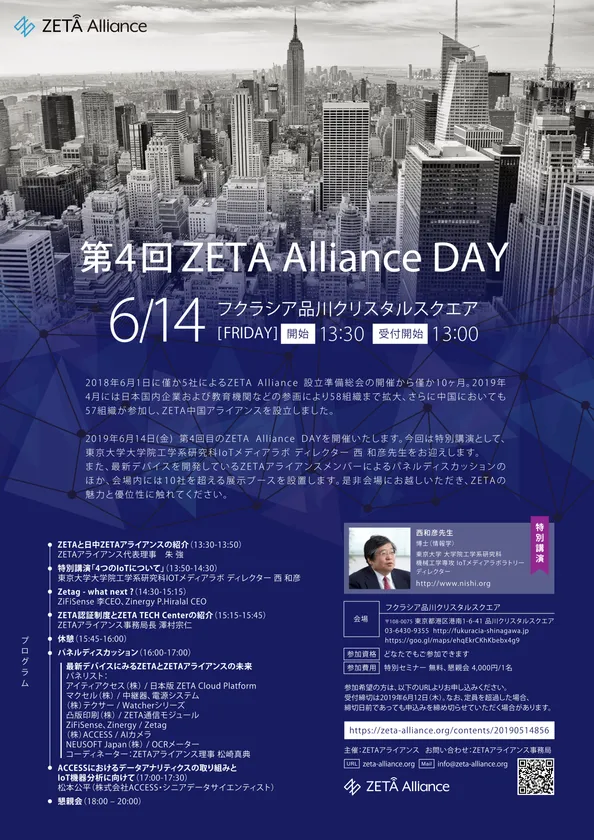 今回は東京大学大学院工学系研究科IoTメディアラボラトリー ディレクターである西 和彦先生をお迎えし、特別講演をいただきます。またIoT業界の最先端サービスを提供するアライアンスメンバー各社により「最新デバイスにみるZETAおよびZETAアライアンスの未来」と題してパネルディスカッションを実施いたします。