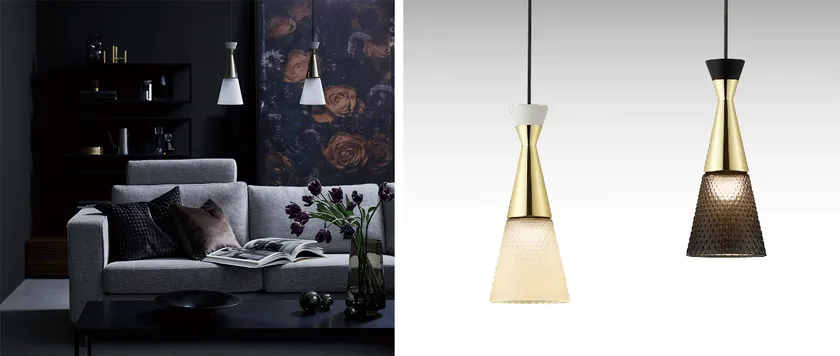 「INTERIOR×LIGHTS」シリーズはインテリアとあかりが創り出すトータル空間美実現をコンセプトに空間を多様に彩るペンダント、スタンドライトを発売してきました。今回発売の「el-glass(エルガラス)」はくびれを施しドレスのような裾広がりのフォルムで、美しさと豪華さを持ち合わせたエレガントな雰囲気をつくり出すペンダントです。ゴールド色のメッキときらめき感のあるガラスといった異素材の組み合わせでリュクスなインテリア空間に合う商品となっています。