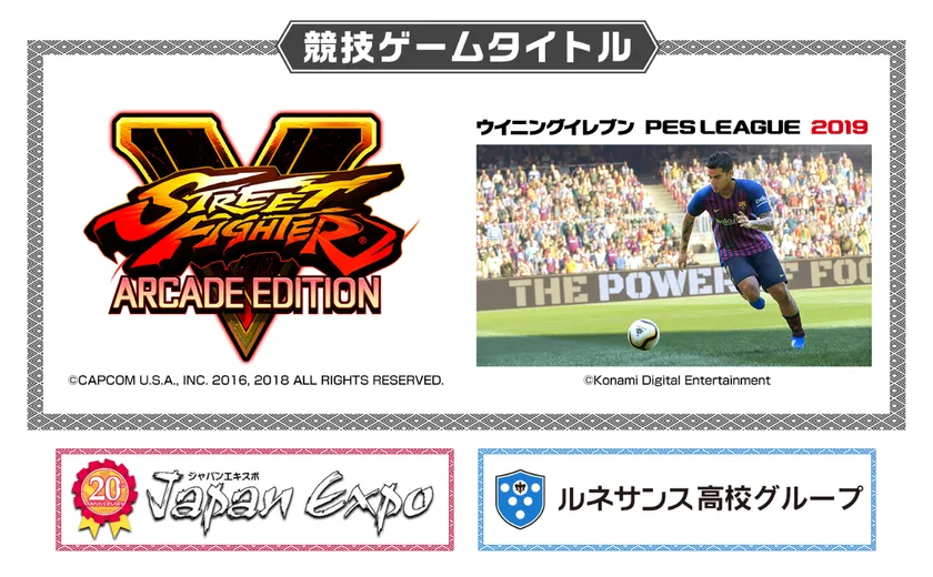 今回のeスポーツ日仏国際交流企画は、ルネサンス高校グループの高校生や、フランスの学生、有名な日本人プロプレイヤーが1,000人収容規模のステージ上で2日間にわたって国際交流試合を行います。競技ゲームタイトルは『ストリートファイター V アーケードエディション(株式会社カプコン)』と『ウイニングイレブン 2019(株式会社コナミデジタルエンタテインメント)』で、パブリッシャーからのライセンス許諾、ならびに一般社団法人日本eスポーツ連合(JeSU)の後援も決定しております。また、eスポーツゾーン内に、大型ディスプレイ複数台を備えたeスポーツを体験できる常設ブースも用意いたします。