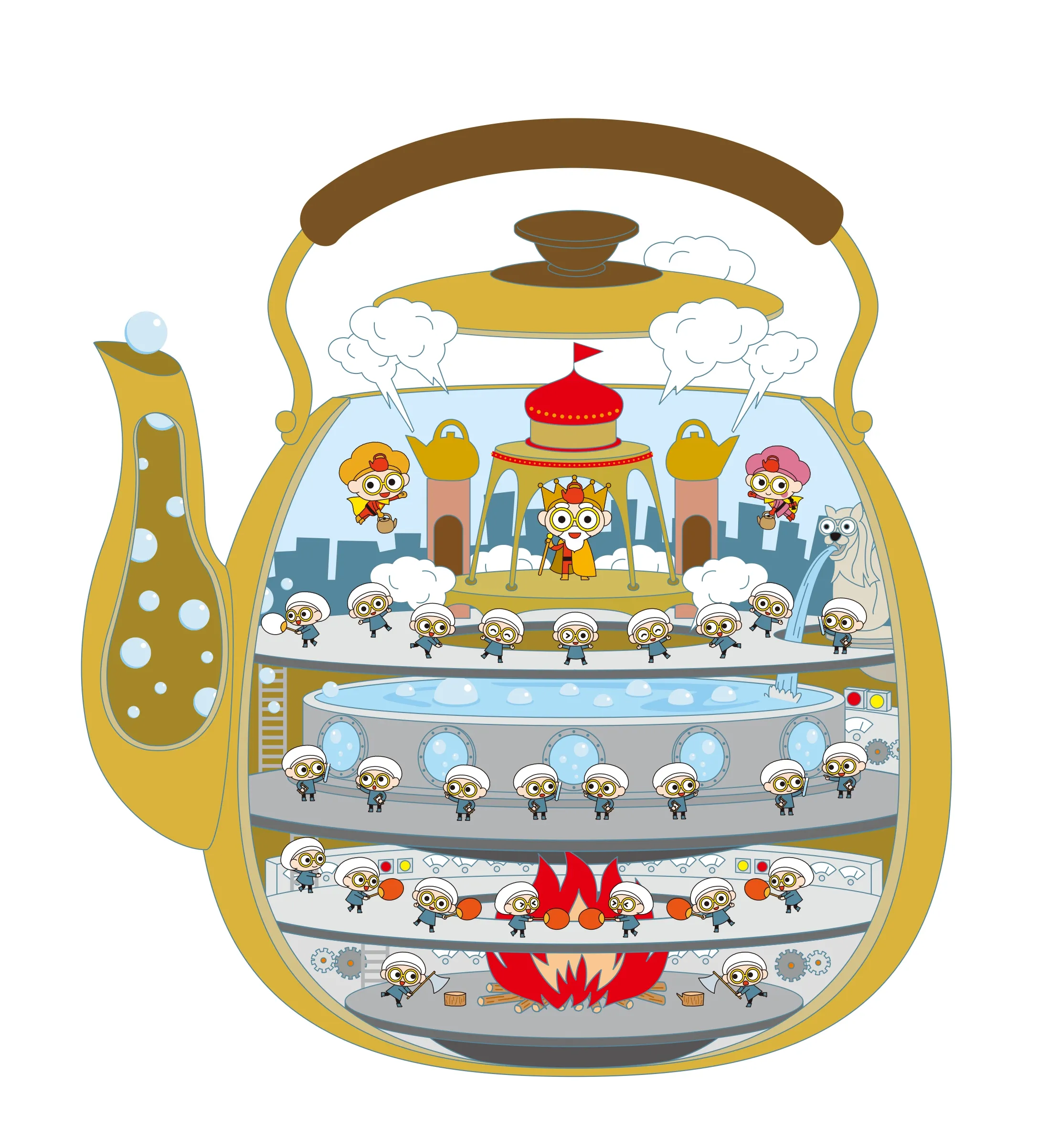 「おなかがすいた・・・」その声をきいたヤカンちゃんはやかんの精たちに合図をします。「イチ・ニ・サンポー!」のかけ声でやかんの精はあっという間にお湯を沸かしてくれるのです。さぁ、これでカップめんが食べられるね!今日も食べごろを知らせてくれる妹のピッピちゃんと一緒にかけつけるのでした。今日もゆくゆく、どこへゆく~!