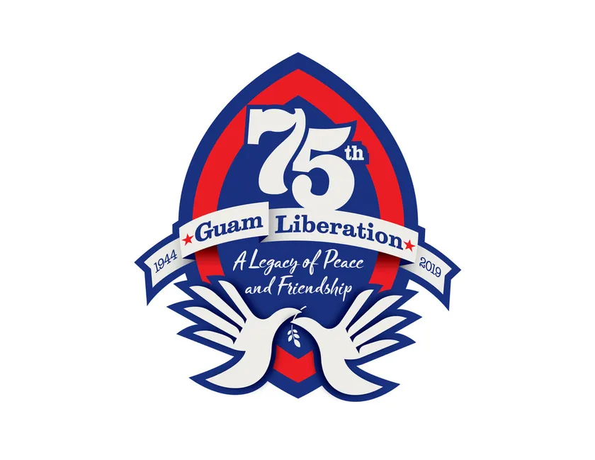 75周年を迎えるリベレーションデーのロゴはアメリカの国旗と同じ赤、青、白を使用しています。背景の盾のようなものはグアムの先住民であるチャモロ人の投石武器スリングストーンで、チャモロ人の勇気、回復力、忍耐力を表現し、現在のグアムの文化的なアイコンとなっています。「Guam Liberation」の両端にある星は、私たちの世界平和への願いや調和を示しています。ロゴの下に描かれている絵は白い鳩とオリーブの枝です。平和の象徴である鳩は永遠の平和を表します。この翼の形は広げられた手を表し、開放性、多様性を象徴しています。