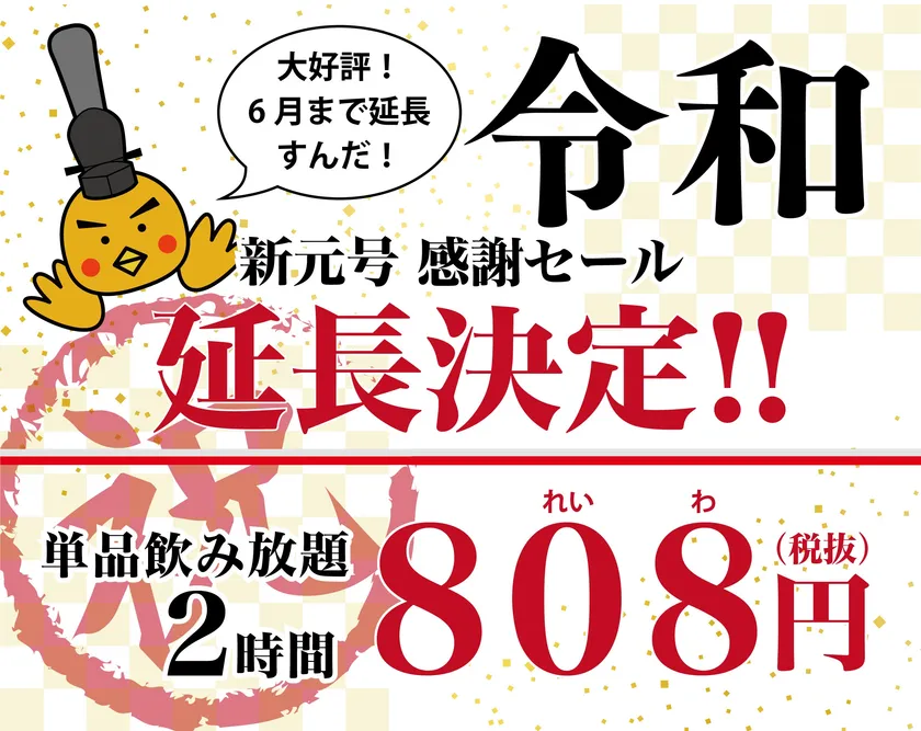 お陰さまで、ご利用の皆様に大変ご好評で、「808円(れいわ)飲み放題」継続のご要望を多数いただいたことから、同セールを1ヶ月間延長(6月30日まで)することにいたしましたのでお知らせします。引き続き、「808円(れいわ)飲み放題」のご利用をお待ちしております。