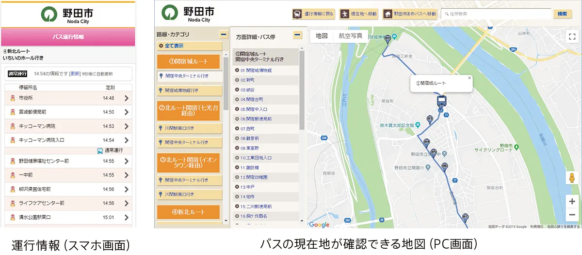 ※バスロケーションシステムとは、GPSなどを利用してバスの位置情報を収集し、バスの定時運行の調整への活用や、バスの現在地や停留所への到着予測時間などを配信することができるシステムです。