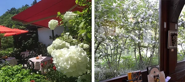 シュトラウス・カフェでは、涼しく心地良いテラス席で美しい花々に囲まれながら、また屋内席では大きな窓越しにオオデマリを眺めながらランチやティータイムをお楽しみいただけます。