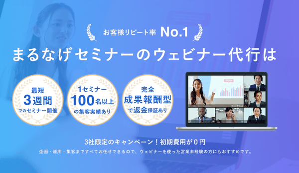 「まるなげセミナー」はウェビナー開催で、最も課題となる集客を解決するために、無料でメルマガ配信(配信先24,000件)キャンペーンを実施いたします。集客に苦戦している担当者の方は、ぜひ検討ください。