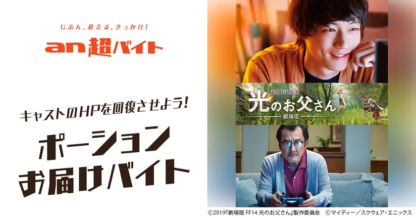 総合人材サービス、パーソルグループのパーソルキャリア株式会社(本社:東京都千代田区、代表取締役社長:峯尾 太郎)が運営するアルバイト求人情報サービス「an」< https://weban.jp/ >は、思わず挑戦してみたくなるような「an超バイト」の新企画として、6月21日(金)公開の映画『劇場版 ファイナルファンタジーXIV 光のお父さん』の舞台挨拶イベントにて、坂口健太郎と吉田鋼太郎のHPを回復させる“ポーションお届けバイト”を2名募集します。採用された方には日給5万円と、キャストサイン入りグッズの報酬の他、全国どこからでも交通費を全額支給いたします。