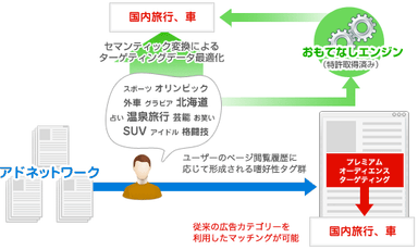 「おもてなしエンジン」とは、WEBページに書かれている文章の内容を解析し、最も本質的な「主意」を表す単語への変換(セマンティック変換)を可能とする国内初の技術です。また同様に、これらのページを訪れたユーザーの「真の興味」を表す単語への変換も行うことで、消費者の本質的なニーズを捉え、最善のデータ(広告やコンテンツ等)をリアルタイムにマッチングさせることができる仕組みです。
