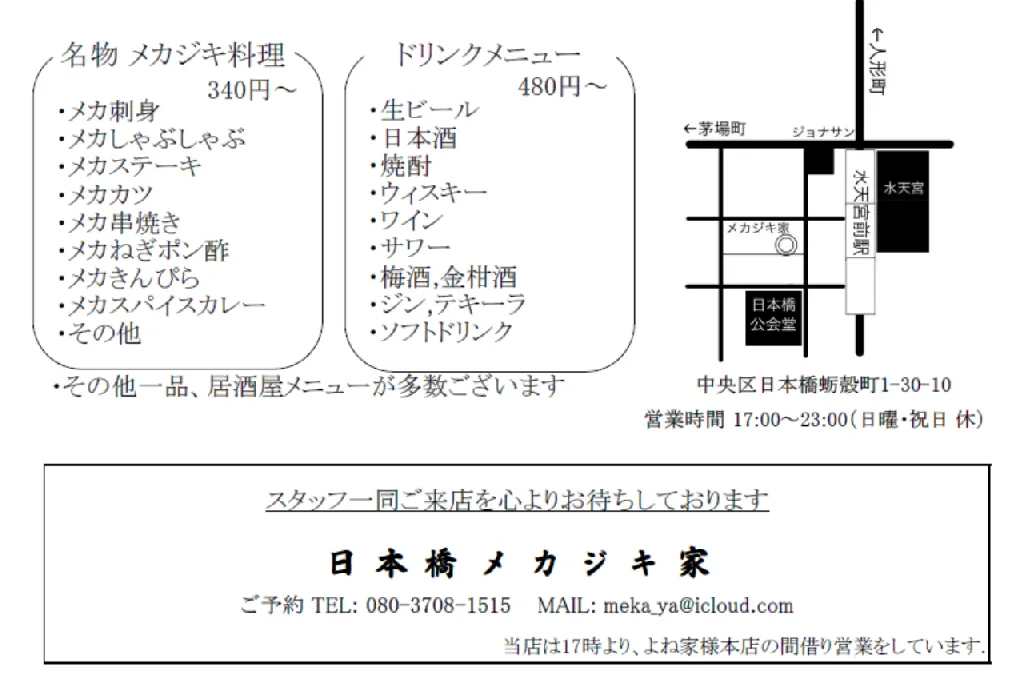 (ご予約受付先 電話:080-3708-1515 メール:meka_ya@icloud.com)