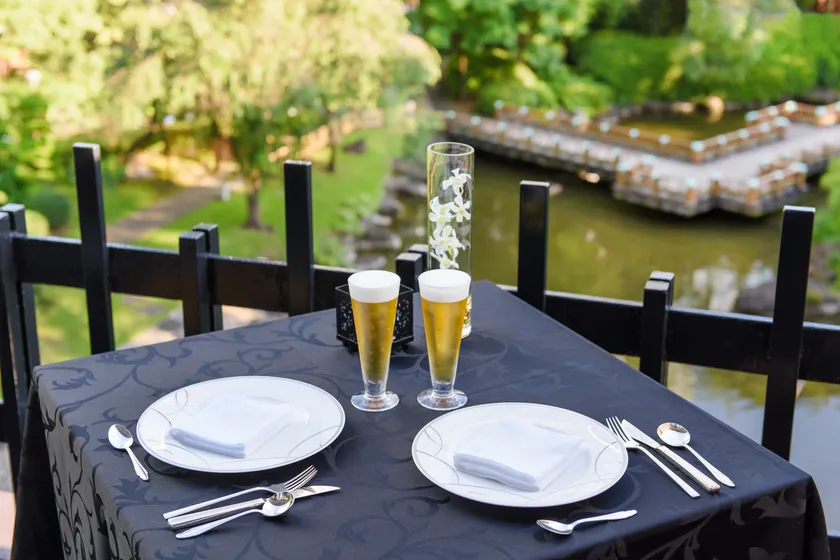 ビアホールのメイン会場は、華やかな和モダンのイメージで団体予約も対応可能な披露宴会場「饗の庭(あえのにわ)」「きざはし」となります。さらには日本庭園に面したオープンテラスのお席もご用意。日本の伝統や文化の心が息づく専門式場だからこそできる一流のサービスでゲストをおもてなし致します。