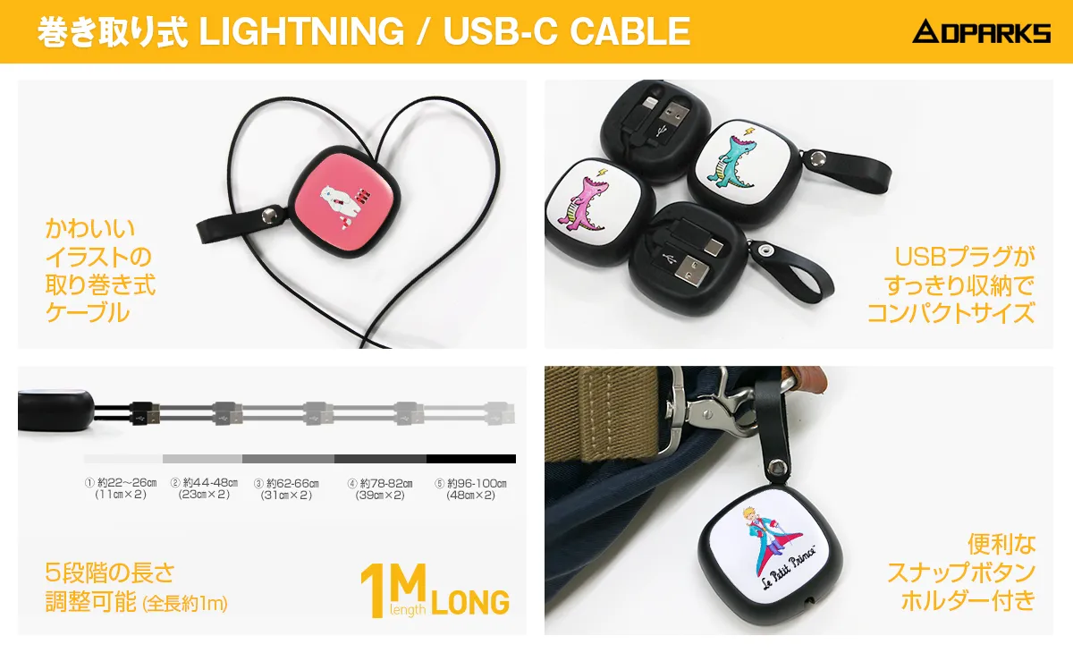 モバイル周辺アクセサリー専門の株式会社ロア・インターナショナル(所在地:東京都新宿区、代表取締役社長:Ally Won)は、高品質なイラストプリントのアクセサリーブランドDPARKS(ディーパークス)から、USB-C・iPhone対応端末の充電&データ通信ができる巻き取り式ライトニング/USB-Cケーブルの販売を開始いたしました。