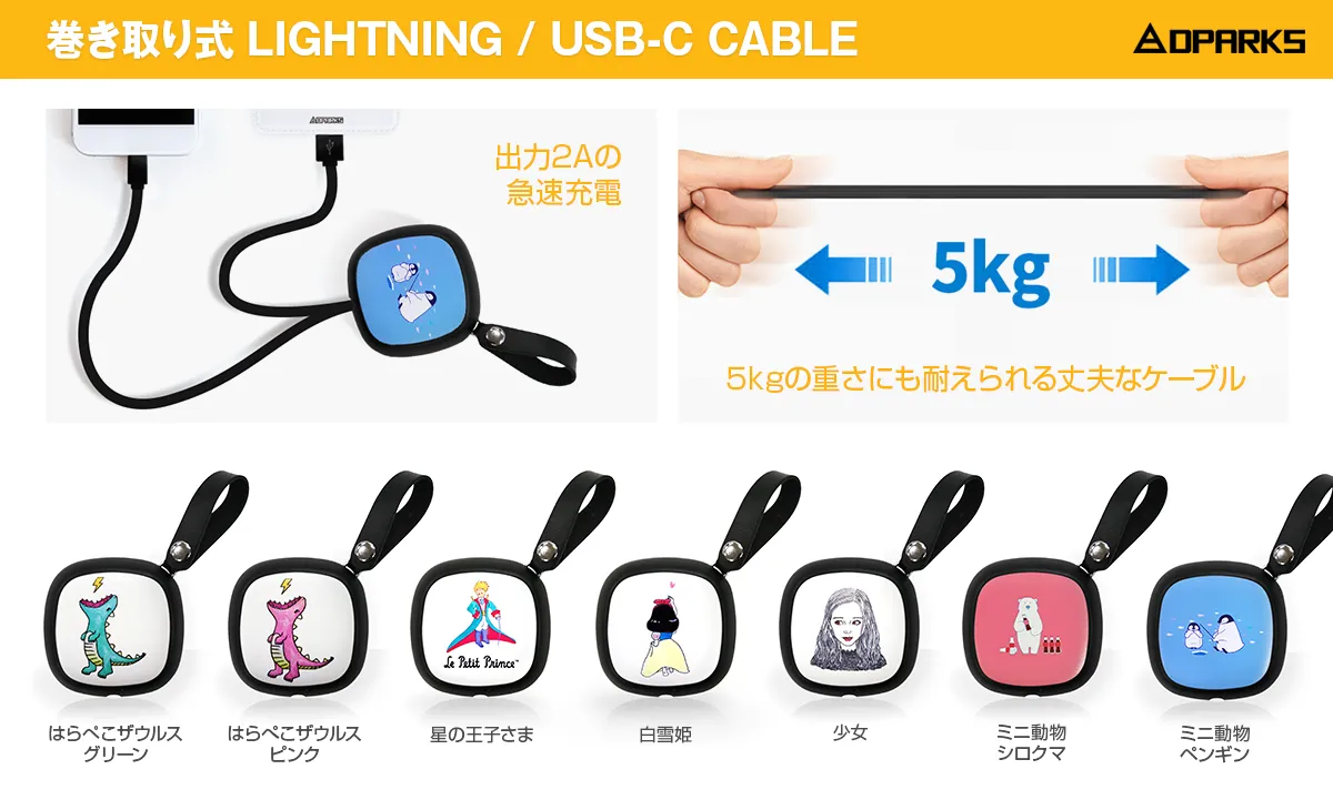 DPARKS、キュートなイラストの巻き取り式ライトニング/ USB-Cケーブル発売