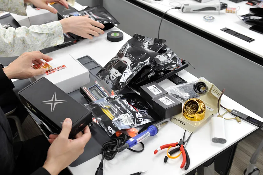 当講座では、最初にパーツ一式をお渡しし、約1日かけて講師陣とともに自分だけのドローンを組み立てます。ドローンの機体は似た形のパーツが多く混乱しやすいのですが、すぐ近くで講師陣の補助を受けながら進めて行けるので、初心者の方はもちろん、独学でのドローン製作で一度挫折をした方でも無理なく完成させることができます。