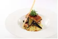 国産ウナギの炙りと揚げナスのマリネ、サフランリゾットを添えて