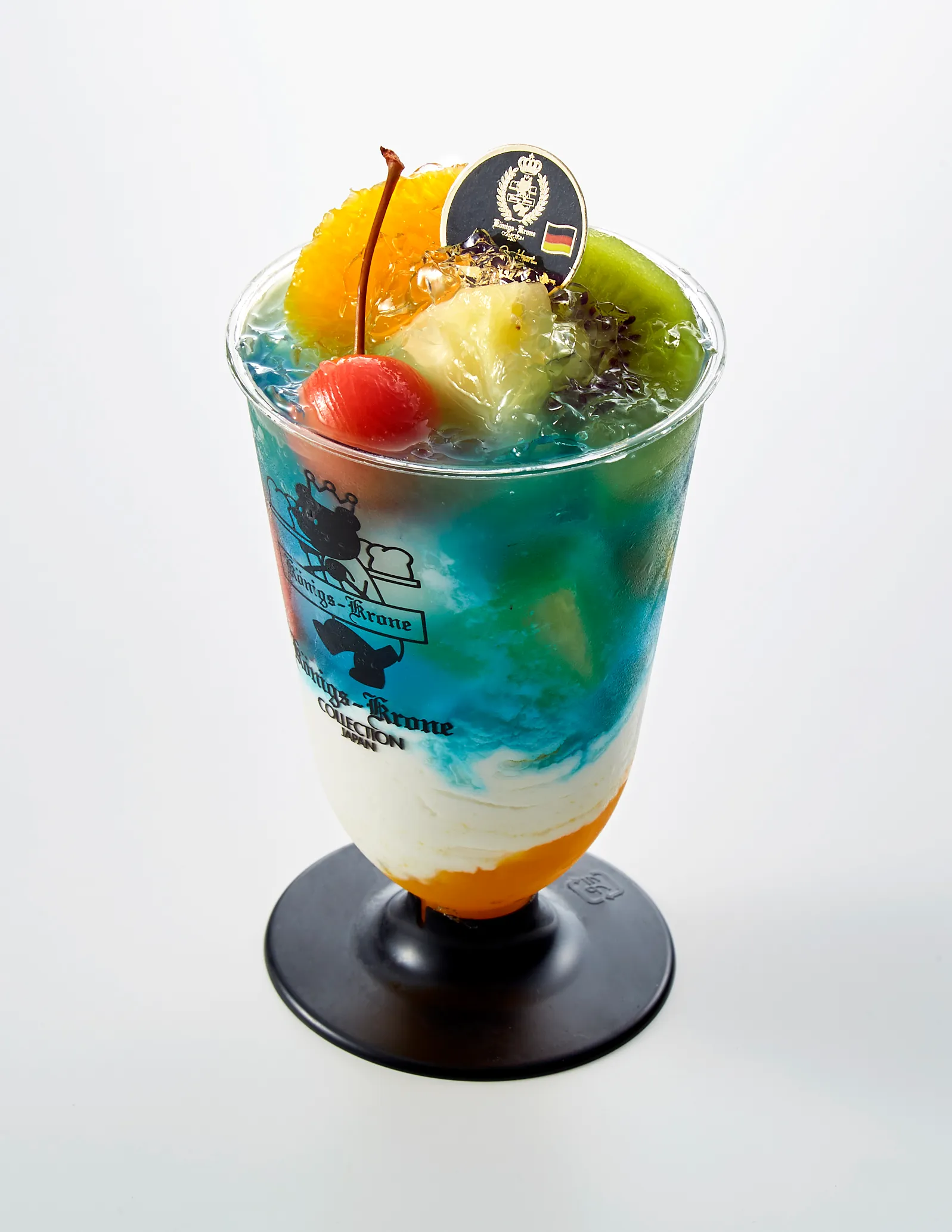 七夕をイメージしたブルーのゼリーにトロピカルフルーツをのせたパフェ。