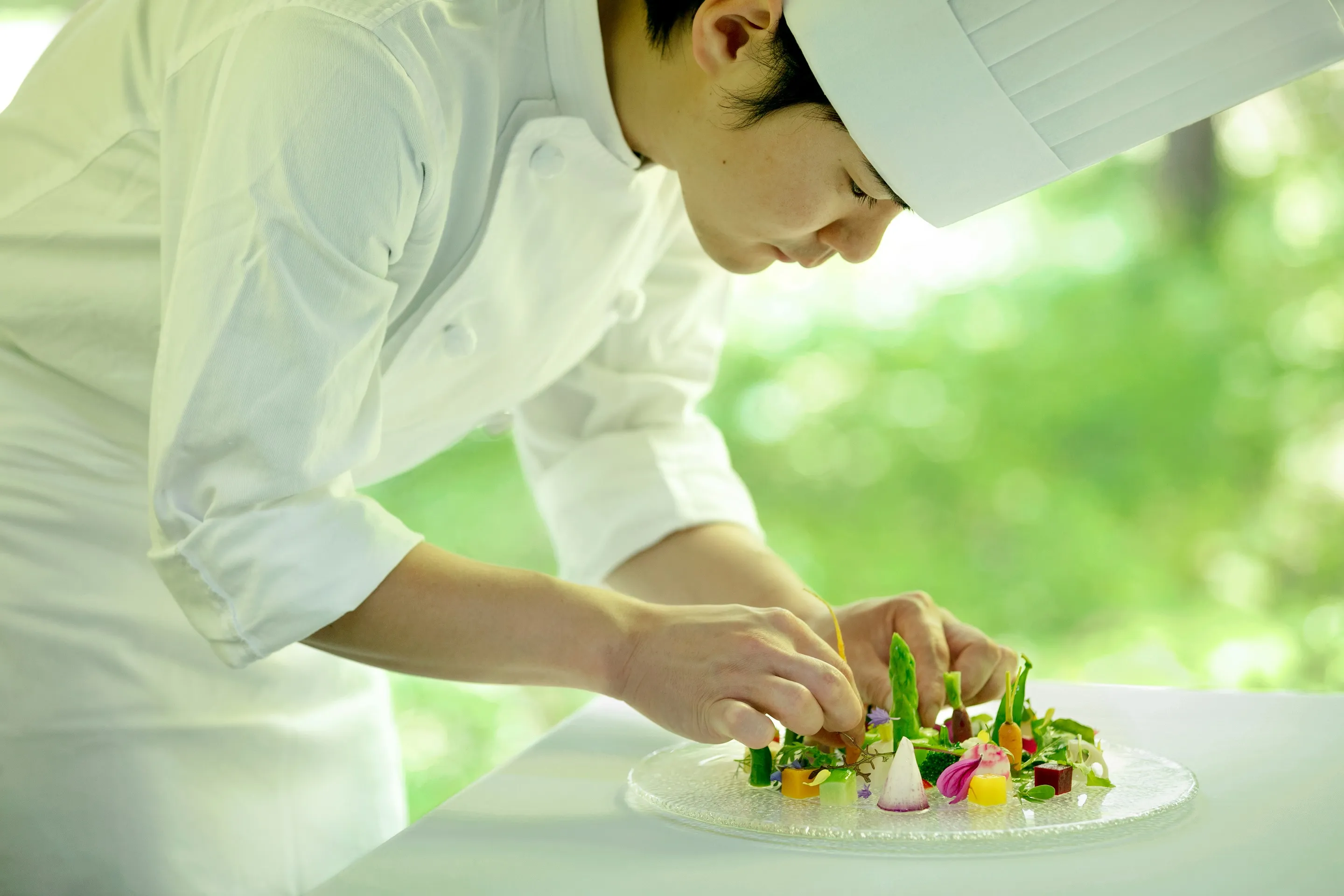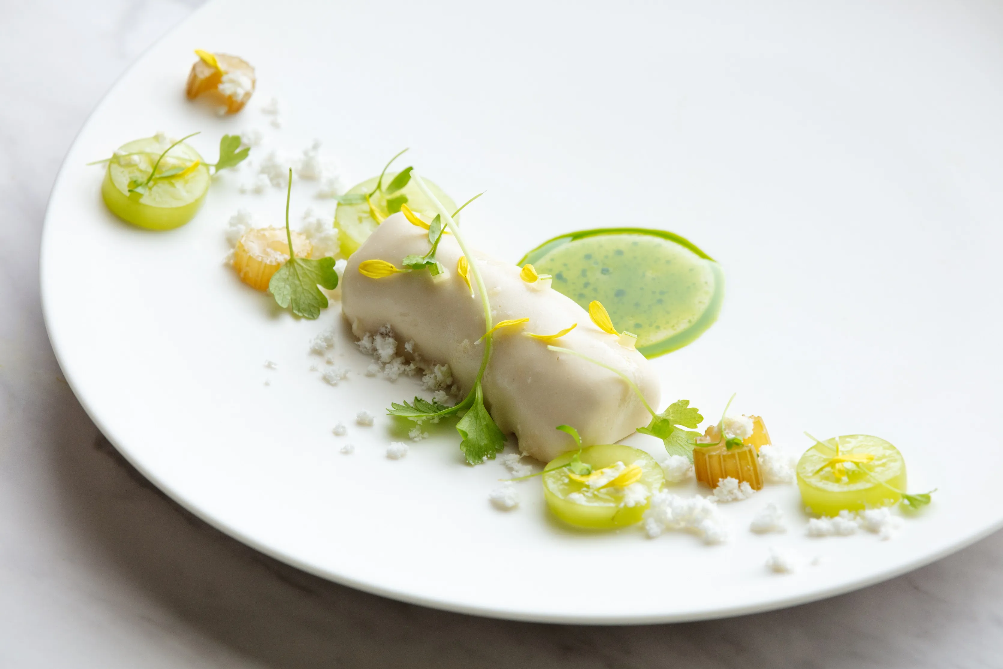 夏の鯉は冬に比べて脂がのっていないため、口当たりがさっぱりとしています。「鯉のショーフロア」は、その旨みと、特徴であるコリコリとした食感が楽しめるよう、洗いとマリネにした鯉に、白ワインとエルダーフラワーの冷やしたソースをかけた冷製料理です。和のイメージが強い鯉を、仕立てを変えて提供することで、今までの印象を覆す、驚きと発見のある味に仕上げています。口どけがなめらかな白ワインとエルダーフラワーのソースは、鯉の食感をより際立たせます。同時に白ワインの酸味が、エルダーフラワーと、付け合わせのセロリやシャインマスカット、ハーブオイルのそれぞれの香りを、鯉とほどよく調和させています。